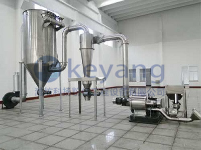 物料由加料系统均匀的送入粉碎室受到高速旋转的粉碎盘的强烈冲击,同时受到离心力的作用,与粉碎齿圈发生碰撞,受到剪切、摩擦、碰撞等多种综合力的作用,使物料粉碎,被粉碎的物料随气流运动到分级区,通过变频调节的分级轮,对粗细物料进行分离,符合细度要求的产品随气流进入旋风收集器和除尘器收集,粗物料返回分级区二次粉碎。